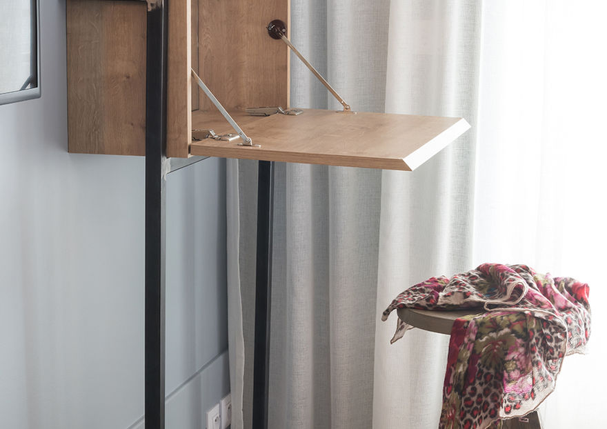 Dans l’épaisseur de la bande de rangement séparant la chambre de la salle de bains, une série de tiroirs qui inclue le minibar et une niche contenant la tisanerie dont l’éclairage se déclenche à l’ouverture de la porte. Le traditionnel bureau consommateur d’espace est remplacé par une coiffeuse suspendue grâce à une armature acier. Pour cet élément comme pour le reste du mobilier, le chêne brut a été retenu. Les matériaux s’expriment dans leur simplicité, sublimés par la finesse du dessin et les accords de couleurs.
